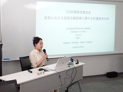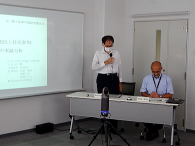 さる10月9日(木)、彦根キャンパス総合研究棟<士魂商才館>において博士後期課程中間研究報告会を対面・オンライン併用で開催しました。本報告会は課程修了による博士の学位申請資格認定の1要件であり、他大学の外部評価委員を含む教員及び大学院生の計26名が参加しました。