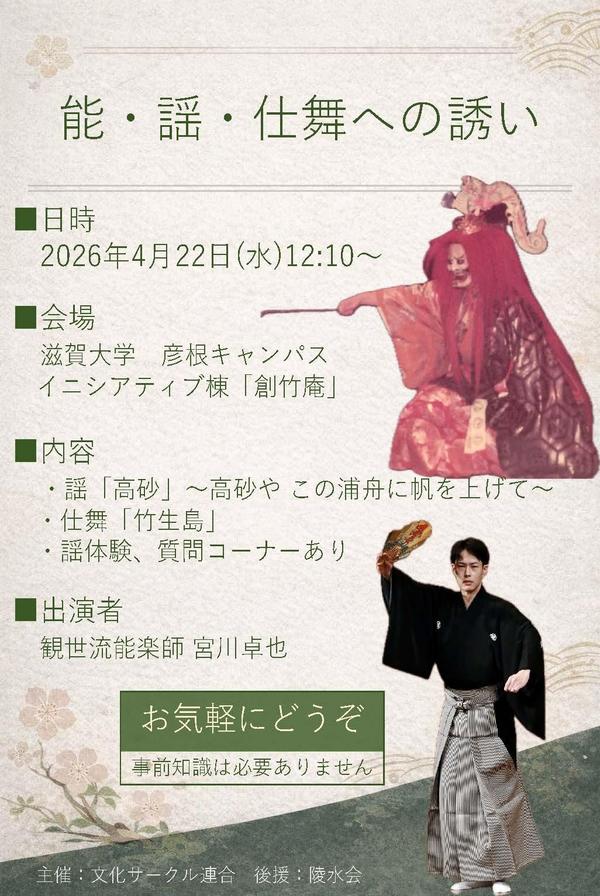 滋賀大学経済学部には、今から30年余り前には、約50年以上の歴史を持つ「能楽部」というクラブがありました。平成の初めころに、無くなってしまいましたが、OBは、健在で時々集まって、謡や仕舞を楽しんでいます。 しかし、そのOB達も高齢になり、来年のOB会で一区切りをつけようということになっています。そこで、現役の学生の皆さんに「能楽」に触れてもらう機会を作り、興味と関心を持った方がいれば、さらに「能楽」に親しんでもらう機会を作り、あわよくば「能楽部」の復活に繋げられないかという、虫のいい思惑をもって、このイベントを企画した次第です。