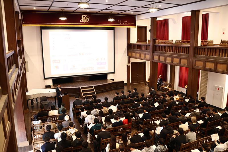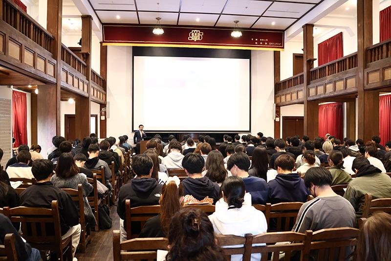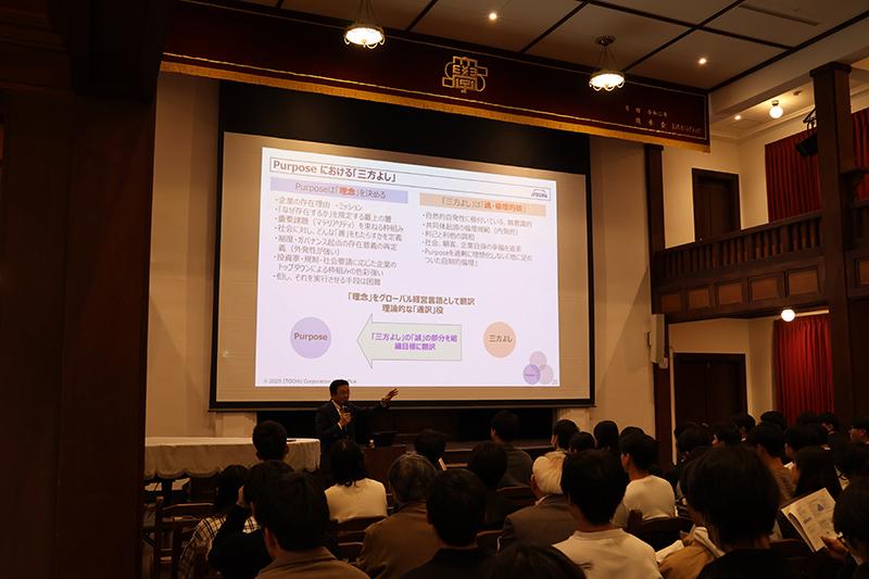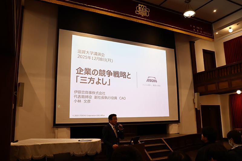2025年12月8日(月)12時50分より、彦根キャンパスの滋賀大学講堂において、 小林文彦先生(伊藤忠商事株式会社 代表取締役 副社長執行役員 CAO、本学客員教授)による講演会 "企業の競争戦略と「三方よし」" が開催されました。多数の学生・教職員が来場し、会場は大盛況となりました。